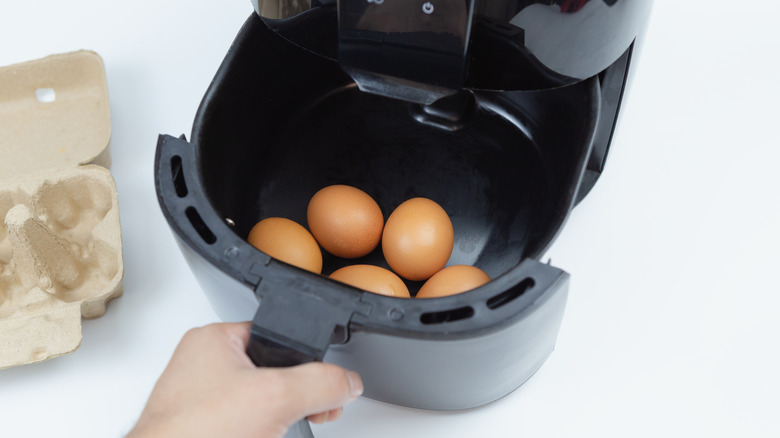 For a batch of perfect air fryer boiled eggs, simply place the eggs directly into the air fryer basket. Another benefit of using this method is that you can cook a large amount of eggs at once — possibly up to 12, depending on the size of your air fryer basket. Cook the eggs at 275 degrees Fahrenheit for nine to 11 minutes for soft-boiled, 12 to 13 minutes for medium-boiled, or 13 to 15 minutes for hard-boiled. Once they're done, transfer the eggs to an ice water bath to stop the cooking process and make peeling a breeze.