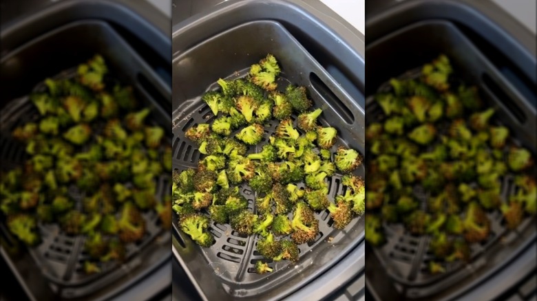 Once you've chopped the broccoli into florets, toss them with a little olive oil, salt, and pepper. For added flavor, you can also sprinkle on garlic powder, lemon zest, or a pinch of red pepper flakes. Spread the florets in a single layer in your air fryer basket, and air fry at 390 degrees Fahrenheit for between seven and nine minutes, until perfectly tender-crisp. Don't forget to shake the basket halfway through, too. Another top tip to give the broccoli a slightly softer texture and prevent burning is to add a tablespoon or so of water to the bottom of the air fryer basket, which will lightly steam the florets as they cook.