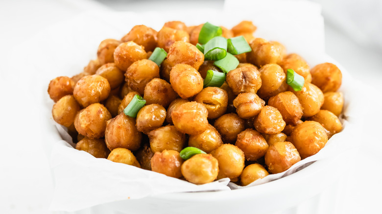 Start by draining and rinsing a can of chickpeas. Then, toss them with a drizzle of olive oil, salt, and any seasonings you like. Paprika, garlic powder, and cayenne pepper are all great choices. Spread the coated chickpeas evenly in the air fryer basket and cook at 390 degrees Fahrenheit for 12 to 15 minutes, shaking a couple of times throughout the cooking process. Once done, the chickpeas should be ultra-crunchy yet still light and airy. Though they're an ideal snack (it's deceptively easy to eat handful after handful!), they can also be added to salads, grain bowls, or roasted vegetable dishes for extra crunch.