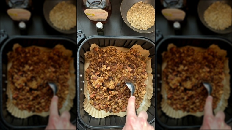 Once your granola mixture is prepared, it's a simple case of spreading it out into a flat, compacted layer in your parchment-lined air fryer basket. Air fry at 330 degrees Fahrenheit for eight to 12 minutes, or until it looks golden brown and crispy. Leave the granola to cool before transferring to a storage jar, where it should keep well for up to two weeks.