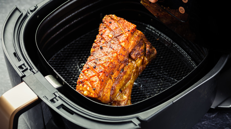 Before cooking the pork belly, you'll need to score the skin, then rub it with a little vegetable oil, followed by a generous addition of salt, pepper, and your favorite spices. Garlic powder, five-spice powder, or paprika all work beautifully. Set the pork belly in the air fryer basket, skin-side up. For a 2-pound pork belly, first cook at 400 degrees Fahrenheit for 30 minutes, until the skin is starting to look crispy, then lower the heat to 350 degrees Fahrenheit and cook for a further 20 to 30 minutes, or until the pork has reached an internal temperature of at least 145 degrees Fahrenheit.
