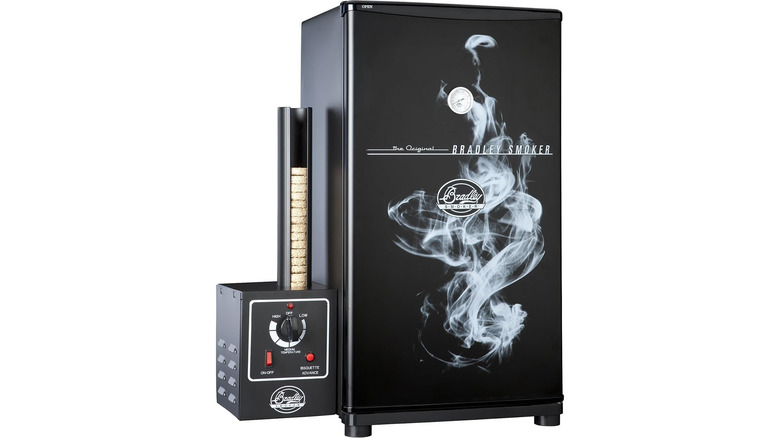 The original Bradley Smoker is a mid-range smoker with an offset design — simply a separate firebox on the side — and a natural draft system to cook and smoke meats. Essentially, wood burns on an electric heating element in a separate small-sized firebox, and the heat and smoke transfer to the main box to cook and flavor meats. It also utilizes a diffuser system that clears the smoke out of the very top of the box, preventing it from accumulating and raining down dirty moisture on that apple cider smoked pulled pork you're cooking.