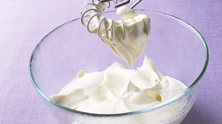 Once you've decided on a method, begin whipping the heavy cream. If you're planning to fold it into a mousse or a batter of some sort, you'll want to aim for soft peaks. That means the peaks that form on your whisk will soften pretty quickly when you hold the whisk up. Medium peaks will be soft but will possess more of a solid structure; the peaks themselves will remain intact when you hold the whisk up. This consistency works well if you're dolloping whipped cream on desserts. Finally, stiff, or firm, peaks work well for dipping and spreading. When you hold the whisk up, the peaks should hold their shape perfectly.