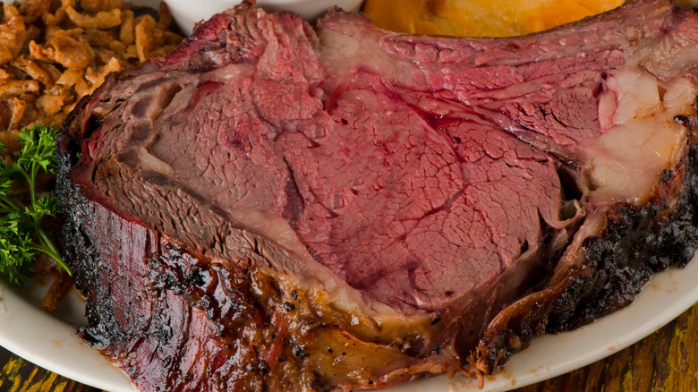 One holiday cooking tip from Alton Brown offers a nice reframe of the naming problem, and a solution for the economy one: Use a USDA choice rib roast, instead. "I like choice," says Brown. "I think it's meatier." He's not making this up. Generally, prime rib cuts have a difference of three to five percent less fat — or marbling — than choice pieces. Considering that you can save between $15 and $25 per pound by opting for choice rib over prime rib, it's a worthwhile switch.
