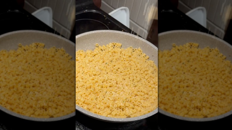 If you've never used ditalini pasta before, it's time to try it out. It's a tiny pasta with a hole in the middle. In fact, it's so tiny that you can fit a ton of them on a spoon — that makes for an interesting texture you're not going to get with other types of pasta. After toasting the ditalini just slightly in a well-oiled pan, you'll stir in some chicken broth. You can also use veggie broth if you want to keep things vegetarian. Heavy whipping cream and butter add to the richness of the sauce, which is seriously the star of the show in this viral TikTok recipe from @jazzypeachco, since you're not working with a ton of other ingredients.