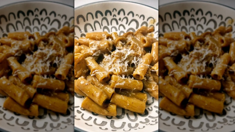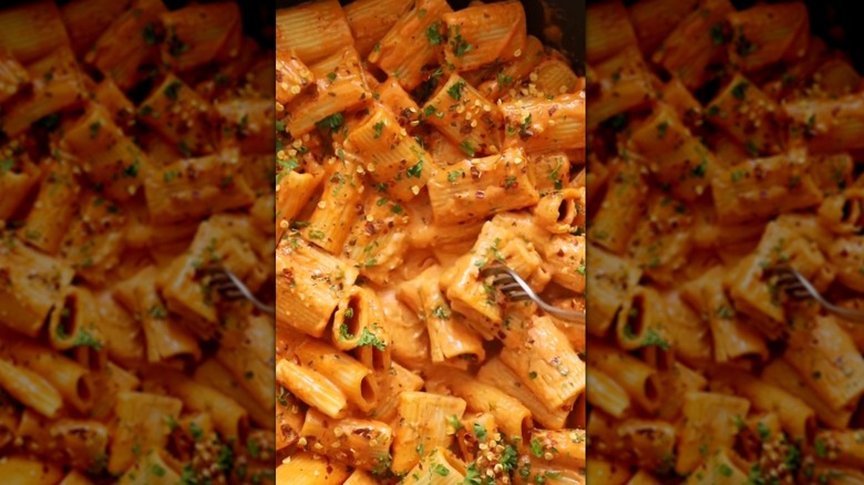 Once the sauce is done, it's time to add your pasta to the dish. Make sure you include a little bit of the pasta water, which makes that already creamy sauce even creamier. Top with dried or fresh parsley along with some chili flakes, and you've got a spicy rigatoni dish that'll blow everyone away. Of course, you don't have to use rigatoni in this recipe, but you'll want to use a type of pasta that has holes or nooks where that sauce can collect. After all, you don't want to miss a single drop of the stuff.