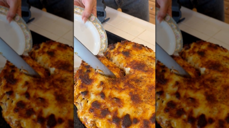 Bake the dish in the oven until that cheese on top has gotten nice and golden brown. Then, you can cut pieces of the dish like a cake, yielding a pasta dish with a texture you've likely not experienced before. Is this the most traditional pasta dish you've ever made? Definitely not. But that's what makes it so fun! And for a dish that comes out looking so impressive, this one is incredibly easy to make.