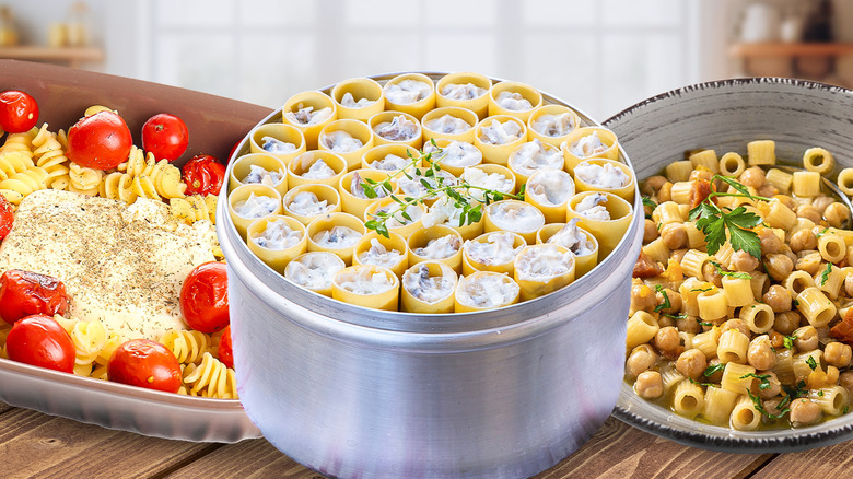 Sometimes, a recipe developer can utilize many familiar ingredients in an unfamiliar way to build a deeply creative dish, and that's exactly what's happening with the viral TikTok honeycomb pasta. In this dish, rigatoni is not used like you would normally think to use pasta. Rather, it's packed vertically in a baking dish where it's then filled with little pieces of cheese sticks. Then, you'll layer some sauce on top of the pasta, followed by meat (if you want to include it) and more cheese (but this time, use the shredded variety). Use jarred pasta sauce if you're trying to get dinner on the table fast, or make it from scratch if you really want this to be a top-notch dinner.