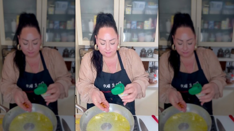 One of the easiest viral TikTok pasta recipes you can make is this lemon capellini dish, originally posted by TikTok user @mammaculinaria. It's light, bright, and refreshing, and can work both as a side and as a main dish. Put a pan on the stove, turn on the heat, and add olive oil, followed by a generous amount of butter. All that rich fattiness provides a base that plays well with the brightness of the incoming lemon. Add some chili pepper to the pan to give the pasta some heat — you can add more or less depending on your spice tolerance. As you add the chili, throw in some minced garlic, as well. That extra layer of flavor is important, as this recipe doesn't call for a ton of different ingredients.