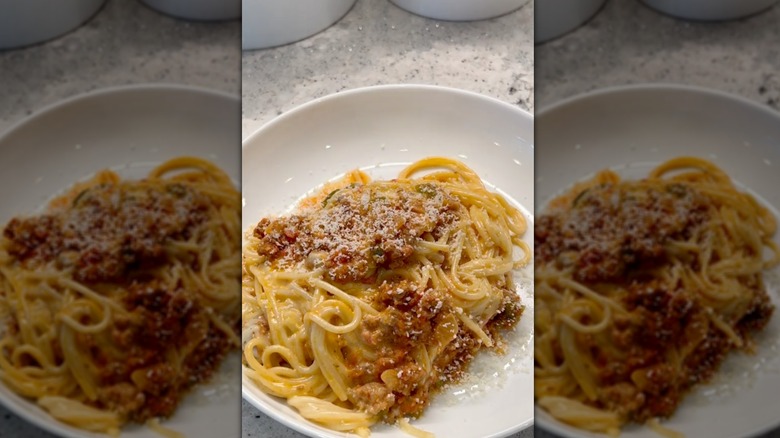 TikTok's viral million dollar spaghetti appears to have its roots in a 2017 recipe from the food blog Spend With Pennies, but the version that's popped up on the app seems to differ slightly from the original. That being said, it's still worth giving a try if you're looking for a pasta dish that truly feels over the top. Unlike a lot of the other recipes on this list, meat is paramount in this recipe. You'll start off cooking some ground beef with chopped onions and bell peppers, then adding a slew of seasonings for flavor. Combine it with some spaghetti sauce (either jarred or homemade) before you get started on the pasta itself.