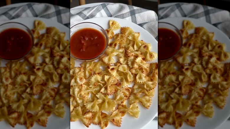 You can eat these pasta chips on their own, but they're even better when you dip them in a side of marinara sauce. Don't be afraid to experiment with other dipping sauces, as well — you never know what might go well together. If you're always craving pasta between meal times, this may just be the recipe you've been looking for.