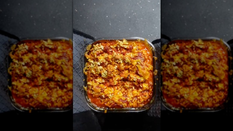 TikTok user @rkihd makes this recipe as easy as possible. You don't even need to boil a pot of water. Rather, you'll just start layering the dry noodles, tomato sauce, and cheese in an oven-safe baking dish. Once you've created several layers, pop the whole thing in the oven, wait for the cheese to get nice and melted, and take it out to let it cook for a while. Then, dig in, enjoying that cheesy, saucy goodness lasagna is known for in a college kid-friendly format. Lazy dinners at home have never been so tasty.