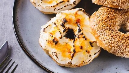 Play into the French toast theme by lining up bagel halves that have been coated in the same sugary, eggy custard you'd use to make restaurant-quality French toast. Cook the bagel pieces, stack them on top of each other, and crown them with your choice of maple syrup, butter, and powdery sprinkles of cinnamon and sugar.