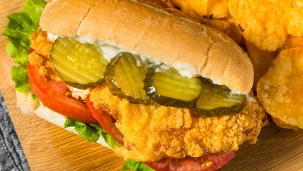 This last part is all about the layering. To nail the hearty essence of a po' boy, slice open your roll and start by stacking the lettuce and tomato. Then, cut your catfish strips into smaller bits and pile those in — loading as much as your roll can handle. Last but not least, finish off with a sprinkle of pickles and a generous spread of the Cajun sauce. Smush it all together and you'll have yourself the off-the-menu mini po' boy of your dreams.
