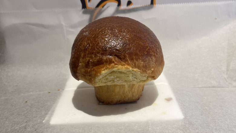 I expected this butter brioche to be a pillowy masterpiece. Behind the glass, it looked puffy and cute. The shiny, brown top was a little darker than I expected, but it tapered to a healthy golden tan at the edges that kept my hopes high. It looked like a Mario mushroom in the cutest way. But I knew it was doomed as soon as I ripped a bite off because it didn't stretch and tear like a proper brioche. Instead it was dry, crumbly, and borderline sad.