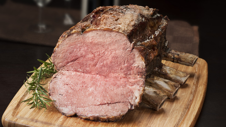 Prime rib has earned its place at the Christmas table by consistently being the top-tier beef choice. Named for it's prized location on the beef rib, it is delicious with a tender, velvety texture, and juicy "eye" (center cut of the rib). Prime rib also comes at a high price, especially when opting for USDA prime grade beef. Tasting Table recently sat down with Alton Brown, who divulged his best holiday cooking tips, and offered up an alternative that won't break the bank and will satisfy taste buds. The creator and host of Food Network's "Good Eats" tells us he prefers choice rib roast — aka a prime rib or standing rib roast made with USDA choice grade meat. "I think it's meatier," says Brown, who is referencing the slightly decreased marbling associated with choice grade standing rib roast.