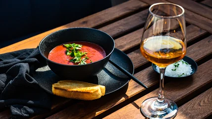 "For this style of chilled soup, normally higher in acid due to the use of tomato, you want a wine that is complementary and can stand up to the freshness and delicate flavors," Elder suggested. "For this, a dry rosé style wine could be really enjoyable." Within the family of rosé wines, you'll have plenty to choose from, since the wine can be made in several different ways with unique regions producing distinct flavors.
