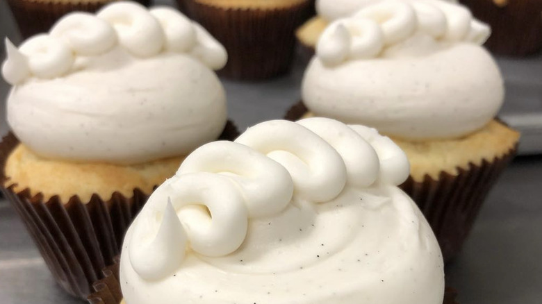 There are two potential pathways that you can take when it comes to making cupcakes. The first is the "easy way out," which involves using canned frosting and focusing the bulk of your efforts on the actual decorating part of the process. Or, you can spend time making the perfect frosting recipe, only to risk having the butter split, the sugar to be ever so slightly gritty, and the consistency to be gloopy. When you think about it like that, canned frosting seems like a safer bet. Realistically, canned frosting isn't that all bad in terms of taste, either. It's decadently sweet and somewhat plasticky, but once you get a bite of it with a decent cupcake, you won't notice it all too much.