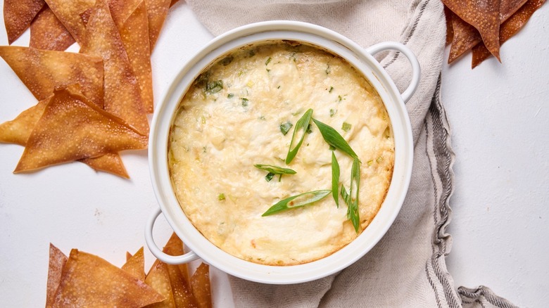 An even cheaper option is imitation crab, which isn't crab at all. Instead, imitation crab is a kind of hot dog of processed seafood products, consisting of various types of minced fish with binders like eggs and cornstarch. It's easy enough to dice or slice into strips for the crab dip, but it's noticeably more chewy than lump or white crab meat. As a Japanese invention, imitation crab is a popular addition to California rolls with cream cheese and jalapeno. Consequently, you can take your crab rangoon dip into a more California roll direction by adding diced and seeded jalapeños and furikake seasoning to the mix. You could also serve the dip with crunchy nori chips.