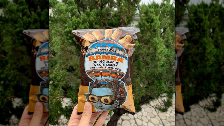 Thanks to the peanut flavor present in Trader Joe's Bambas, the puffs themselves are pleasantly salty. But the real sweetness comes from the hazelnut filling. Each Bamba is stuffed with a sweet, smooth, hazelnut-flavored cream, making them taste so good (and arguably even better than the basic version). The gentle crunch from the puffy exterior is the perfect contrast to the rich cream inside — the ideal sweet and salty pairing all in one snack. Some fans even say they're grateful Trader Joe's made the product seasonal, since they can't stop themselves from buying it.