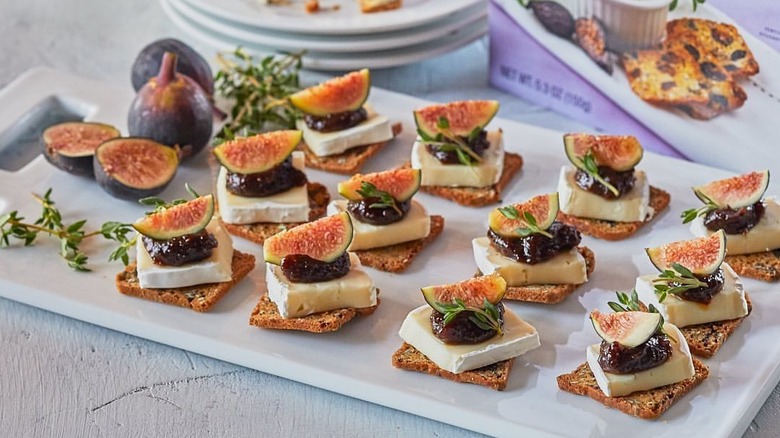 These crackers are a charcuterie board classic that look fancy with the bits of olives and figs inside each piece. This combo gives them a gentle sweet and salty flavor. Pairing two of cheese tastings' finest partners (figs and olives, of course) in a cracker is absolutely genius — you don't need any other ingredients to bring out all the key flavors of your cheeses, dips, and spreads.