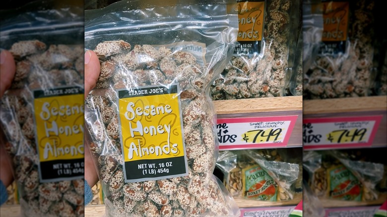 Sesame honey almonds have been known to appear in the fall and winter seasons — and there's also a similar variation made with cashews, which are a little more common to find in stores. Trader Joe's frequently discontinues and later restocks many of its beloved snacks, so keep an eye out for this sweet and salty favorite to make a reappearance. You should also know that these almonds make up part of Trader Joe's "A Trio of Almonds" snack tin (along with plain salted almonds and caramel coffee almonds), so don't be shy about stocking up on those tins (which typically appear during the holidays), either.