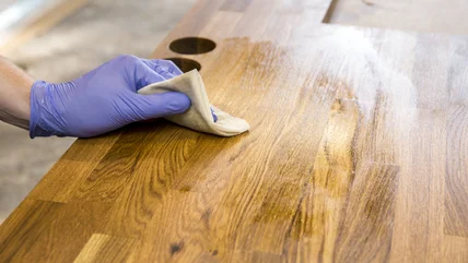 From here, simply rub the oil into the wooden surface using a firm circular motion, following the direction of the grain and covering the entire area. In five to 10 minutes, your board will visibly absorb all the shiny standing oil. But, for total absorption, allow the board to rest for at least four hours or ideally overnight.