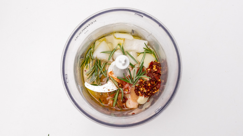 - Add the white onion, garlic cloves, white vinegar, lemon juice, olive oil, chiles, smoked paprika, rosemary, cayenne pepper, salt, and 2 tablespoons of water to a blender.