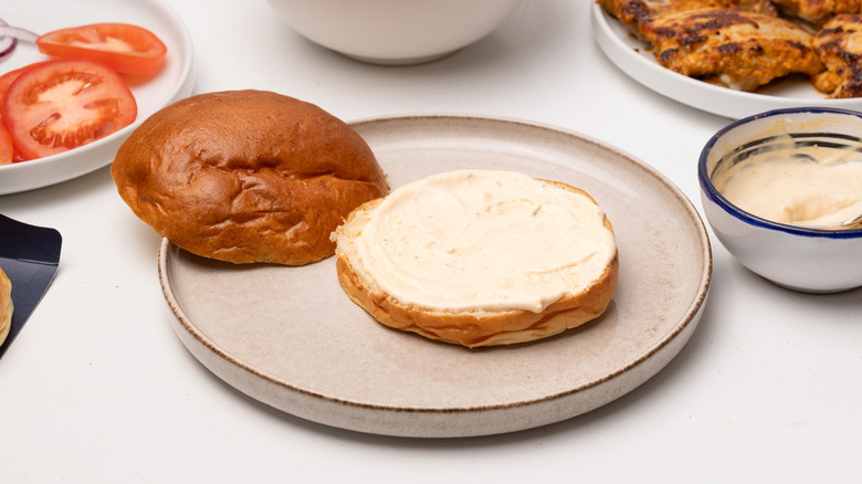 To assemble the sandwich, spread a spoonful of peri peri mayonnaise on the base of the bread buns.