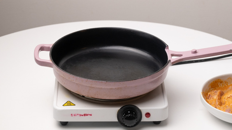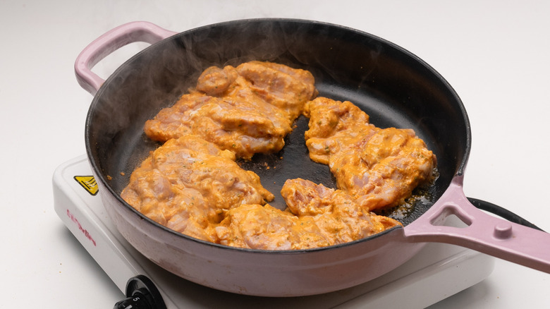 - Flip the chicken thighs and cook for another 6 to 8 minutes until cooked through, then remove from pan.