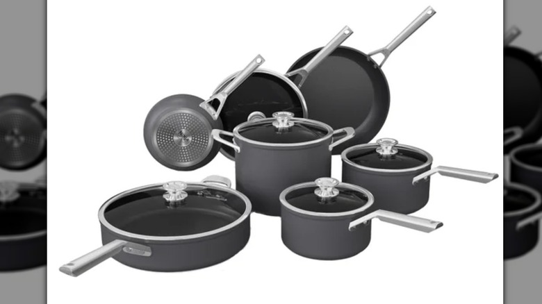 If you're seeking something with more than just pots, then you may want to consider the Circulon Premier Professional 10-piece nonstick cookware set. The brand has a few sets available at Costco, but this particular one has thousands of five-star reviews. It is one of the least expensive sets on this list and comes with two saucepans, two skillets, a saute pan, a stock pot, and four lids, giving you more flexibility in what you want to cook. Imagine making a simple sauteed broccoli dish in the saute pan and boiling pasta in one of the saucepans. You can drain the water with ease because both saucepans have pour spouts on the side to simplify the cooking process.