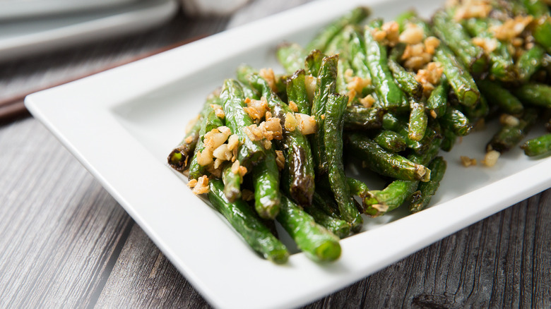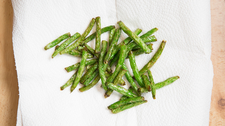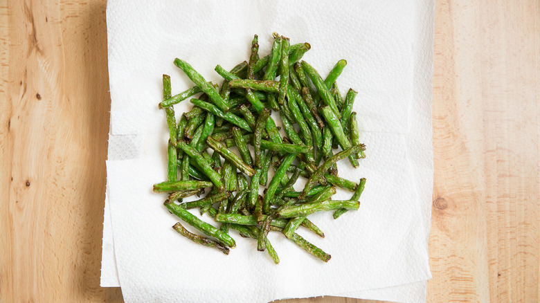 - Remove the green beans from the pan with tongs or a wire mesh strainer and place them on a paper towel-lined dish to absorb excess oil.