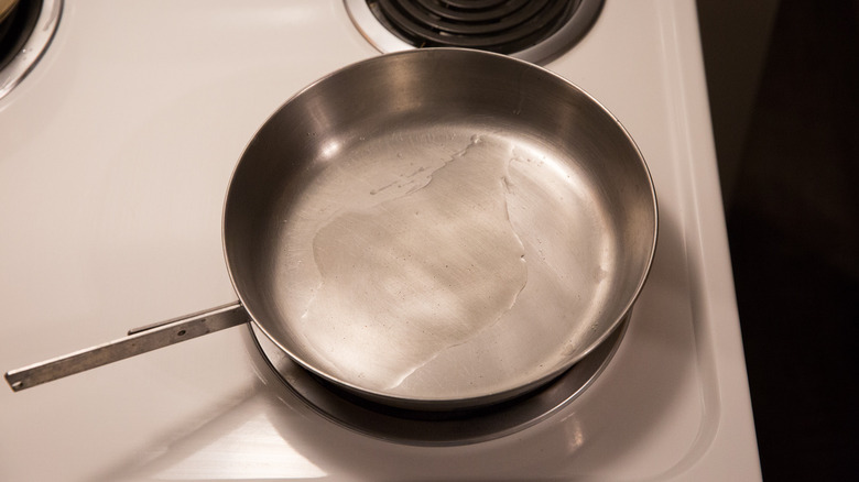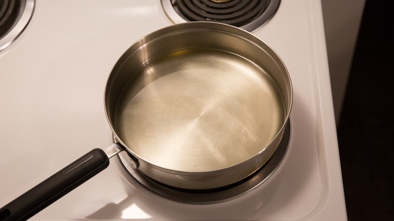 - Pour about ¾ inch of oil into a large skillet and heat it on medium-high to 360 F. The oil is ready when a grain of rice or a piece of green bean floats and sizzles vigorously when dropped in the oil.