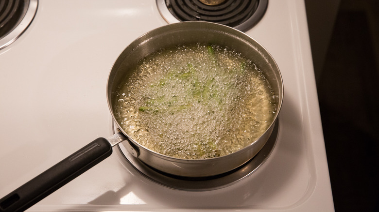 Instead of deep frying the green beans before tossing them with the sauteed garlic, salt, and bouillon powder, you can blanch them first. To do this, cook them in boiling water for about 2 minutes until tender-crisp before submerging them in ice water to stop the cooking. Then toss the beans in the pan with the other ingredients until evenly coated. Although they won't have as much flavor, they will have a brighter green color when you use this method. If you'd prefer to skip the blanching step, saute the raw green beans in oil in a frying pan until tender-crisp before adding the garlic. Once the garlic is browned, add the salt and bouillon powder and toss everything together.