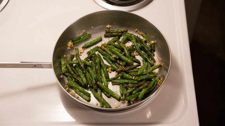 - Repeat the previous 2 steps with the other half of the green beans. Remove the pan from the heat.