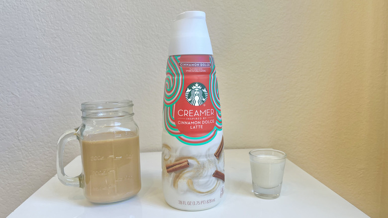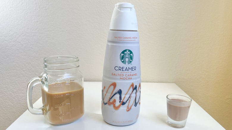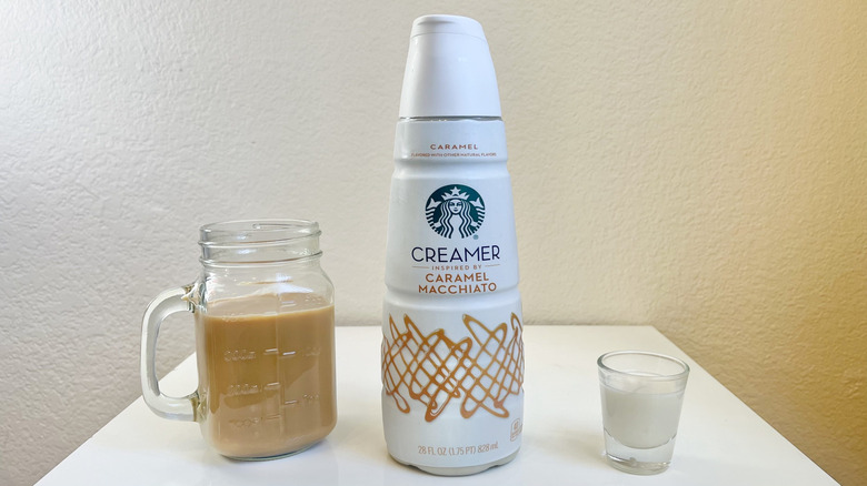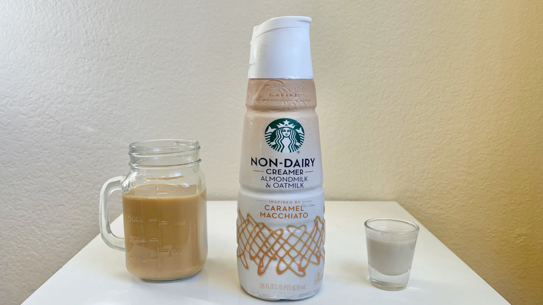 We've made it to the top — the top of this list of Starbucks creamers, that is. The brand's Caramel Macchiato Creamer is chef's kiss. It's luxurious and sweet with notes of caramel and vanilla. I very much enjoyed the cinnamon profile of Cinnamon Dolce and the salty sweetness of the Salted Mocha Caramel, but each of these had a distinct flavor that might dissuade you from using the creamer very frequently. You may not want to sip on a cinnamon beverage or a salty coffee every day, but caramel is a bit more approachable for daily use.