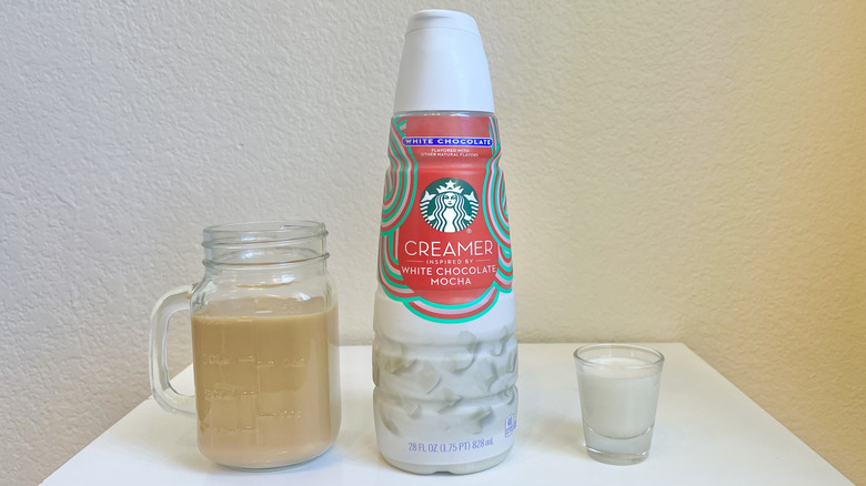 The creamer has mild notes of spice, but the creaminess comes through the most. Because of that, I yearned for more spice. I don't feel that this creamer is comparable to the in-store Starbucks Pumpkin Spice Latte (or PSL), which is amped up with kabocha pumpkin puree. Plus, this creamer is rather lightly flavored compared to other seasonal options I sampled during this taste test. While this flavor was more noticeable in my morning brew than that of the white chocolate mocha creamer, I'd prefer some other choices.