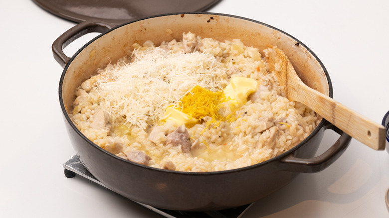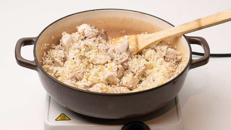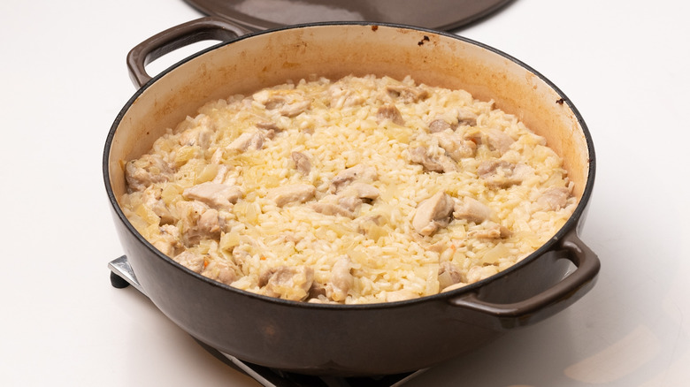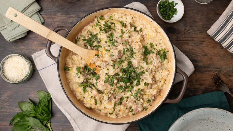 Although delicious and very affordable, risotto is quite often a dish that is left to the professionals, due to the complexities of getting it just right. However, this lemon chicken oven risotto, from the kitchen of recipe developer Jennine Rye, makes cooking risotto about as simple as it can get. No need for arduous stirring and feeding the rice with stock in this recipe, instead, simply saute the onion and chicken and then add the white wine, stock, and risotto rice to the pan and let the oven do the hard work for you. With some butter, Parmesan, and just a little bit of stirring at the end, you'll end up with a wonderfully creamy and rich risotto to be proud of, flavored with succulent chicken and a delicious lemony kick. Read on to find out how easy it can be to make risotto in the comfort of your own home.