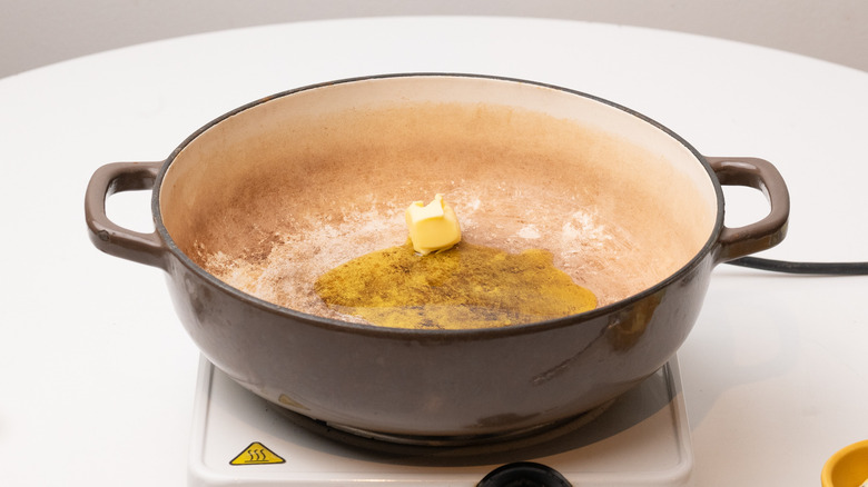 - Add the olive oil and 1 tablespoon butter to the pan.