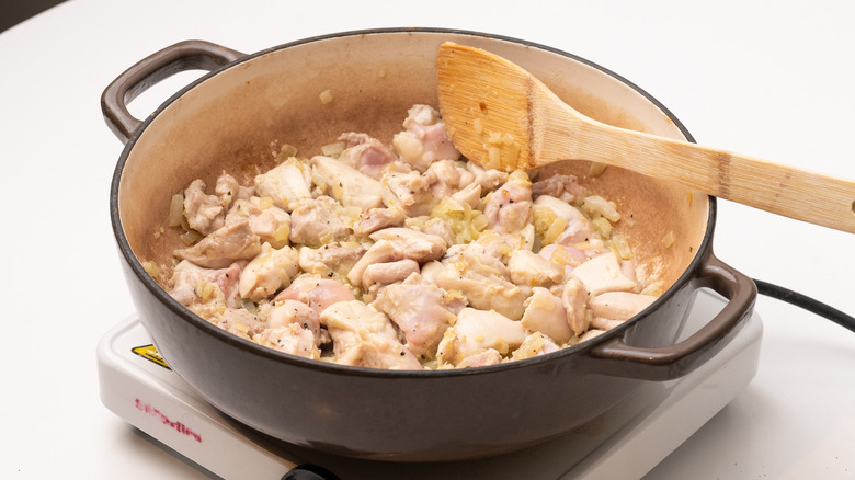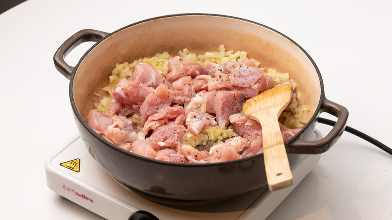 Add the diced chicken thighs to the pan along with the salt and pepper.