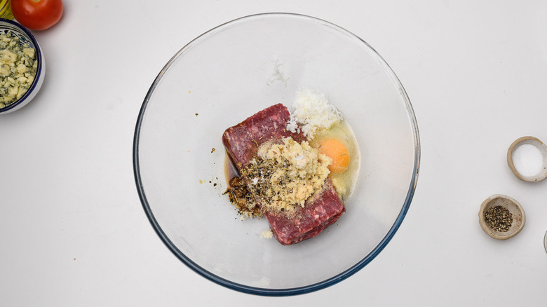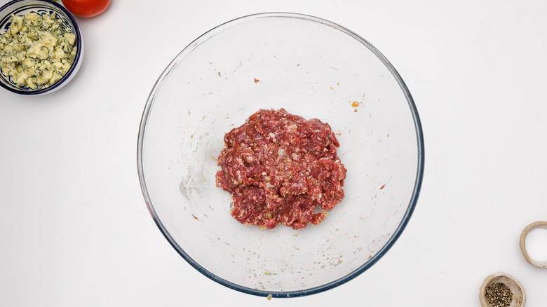 - In a bowl, add the ground venison, breadcrumbs, beef fat, egg, onion granules, garlic granules dried rosemary, Worcestershire sauce, salt, and pepper.