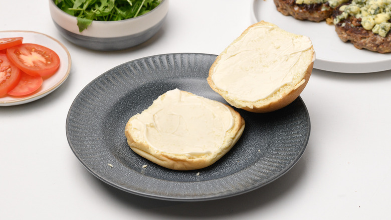 To assemble the burgers, spread a little mayonnaise on the top and bottom of each bun.