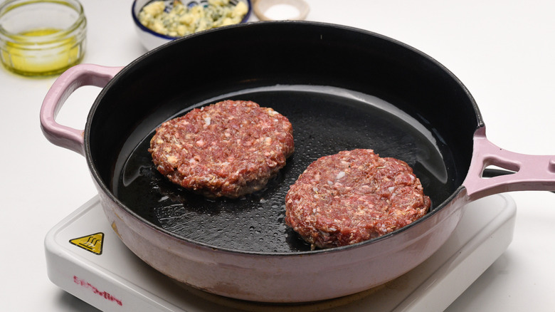 - Add the venison patties to the pan and fry for 3 to 4 minutes on one side.