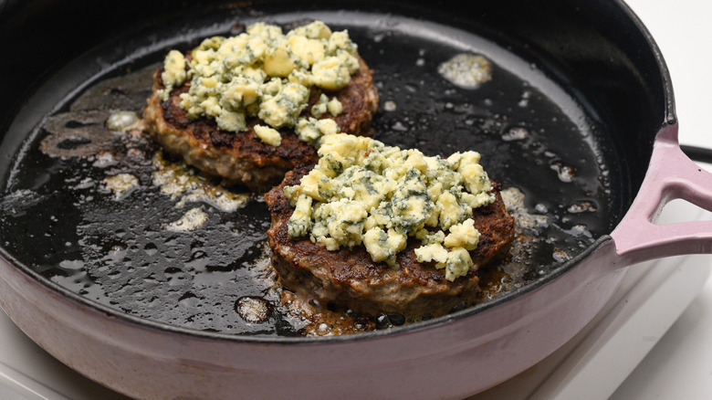 - Divide the crumbled bleu cheese between the venison patties and cook for another minute or two.