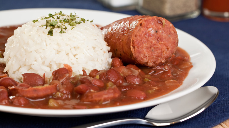 A proper pot of red beans should be simmered low and slow, with the Cajun trinity of onions, peppers and celery along with a decent amount of pork sausage for flavor. The beans will soften and become tender when properly cooked, and many cooks like to mash part of the beans to create a creamy texture to bind the cooking liquid surrounding the meat and beans — but there should still be some bite and texture in a properly cooked red beans and rice recipe. Fluffy steamed white rice is the counterpoint to the thick bean mixture, ready to stir in and soak up all the delicious juicy flavors.