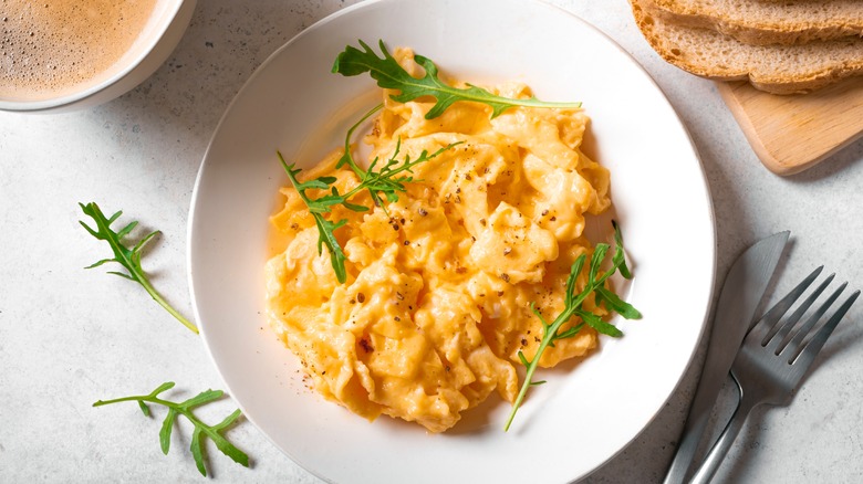 Serving the scrambled eggs for brunch, you'll also want something on the side to complete the meal. It could simply be avocados and a few slices of toasted bread or biscuits — the all-time foolproof combo. Better yet, serve them in tiny brioche buns and turn them into finger food delightful enough to share over lively conversations. On the plate, however, you can keep them company with a colorful veggie medley of spinach, cherry tomatoes, asparagus, and anything else you'd like.