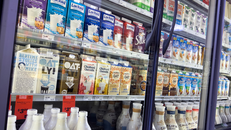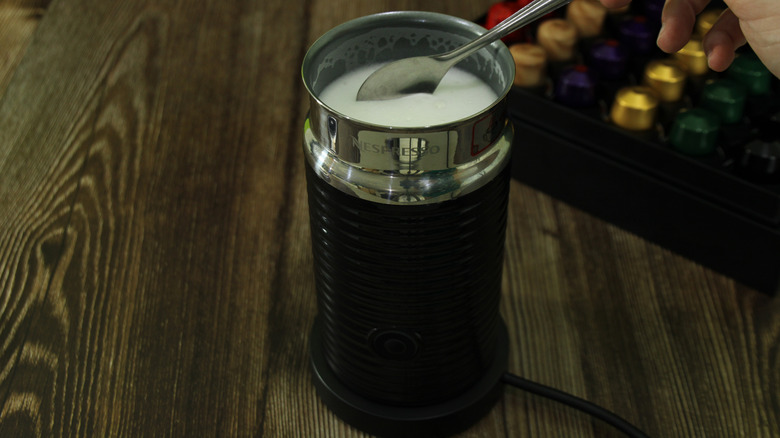 According to Nespresso, you can safely use all sorts of milks in your frother, such as oat, soy, or almond milk as well as whole milk and skim milk. The texture of the froth depends greatly on the percentage of fat in your selected milk and whether it's been chilled — refrigerated whole milk and coconut milk, for example, will produce a much creamier and silkier foam than a room-temperature soy milk. The problem occurs if you attempt to use any variety of store-bought beverage that's been blended with sugar because the heating element at the base of an Aeroccino could cause the added sweetener to caramelize and burn.