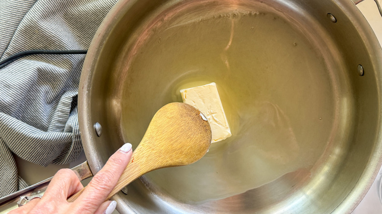 - Add the butter to a large skillet and bring the heat to medium-low.