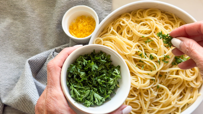 - Top the pasta with the chopped parsley and lemon zest before serving.