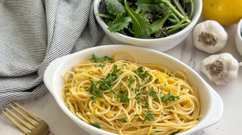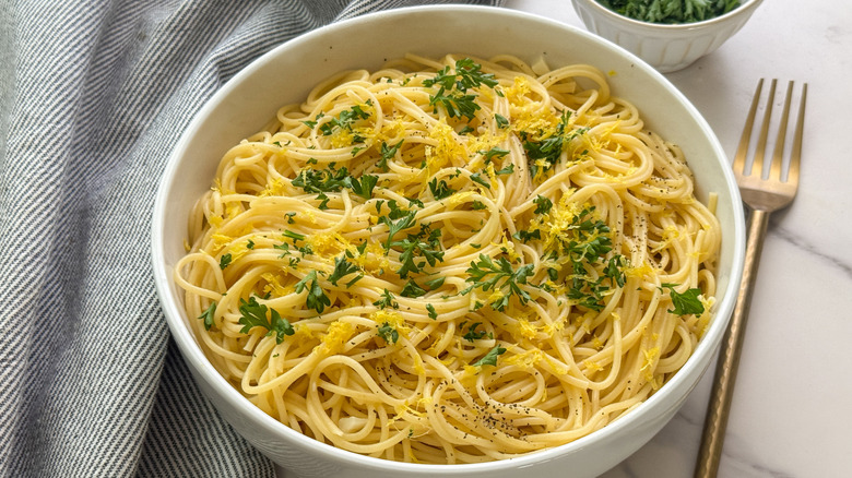 Chances are that you have most of the ingredients to make this recipe already in your kitchen. If you have to head out, you'll need garlic, parsley, and lemon from the produce aisle. Then, pick up some unsalted butter and Parmesan cheese. If you only have salted butter on hand, that will work fine — just cut back on the added salt in the recipe. Then, you'll need some spaghettini or thin spaghetti, salt, and pepper.